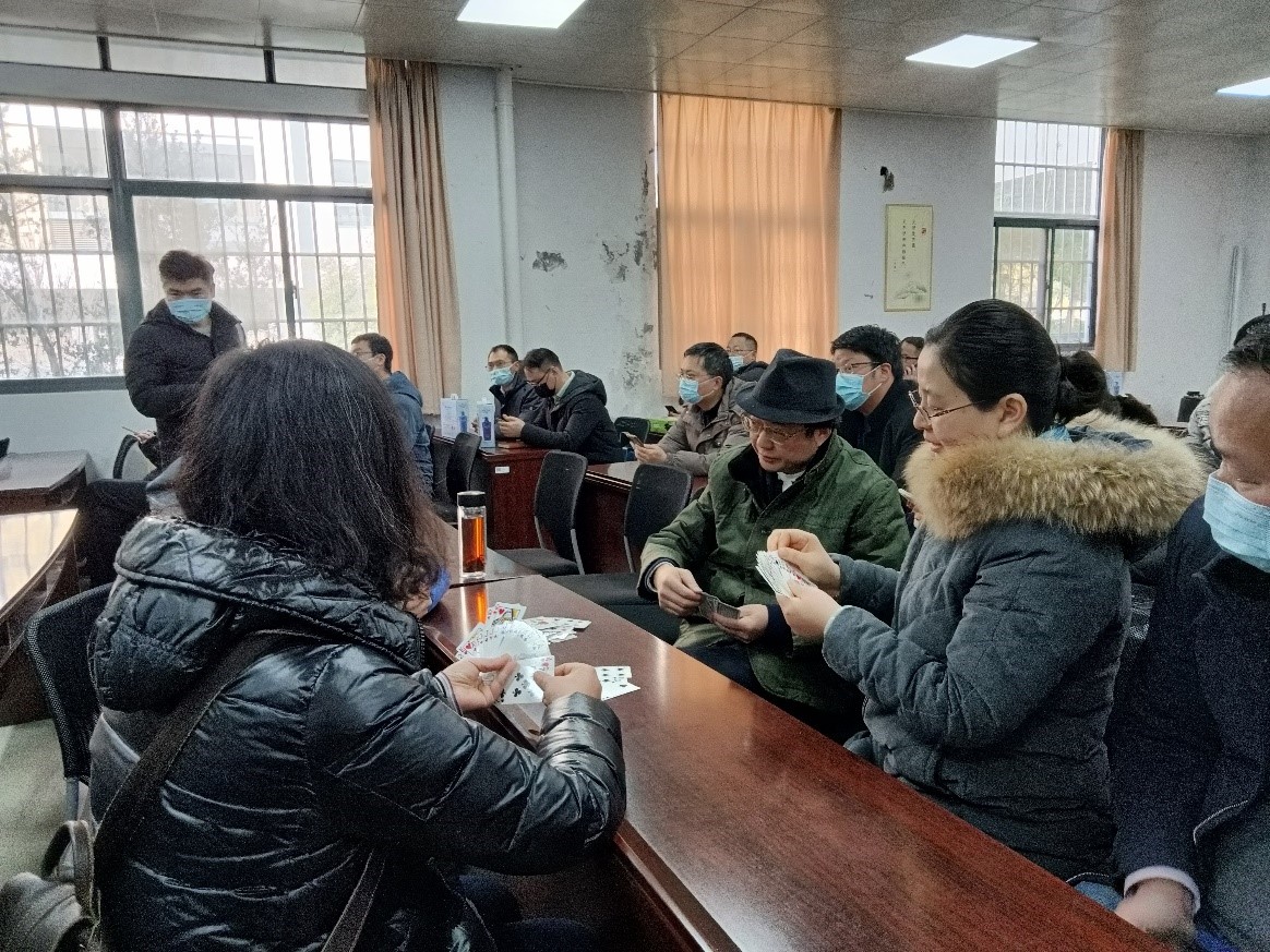 为了丰富教职工的业余文化生活,增加部门教师们的凝聚力,2022年1月5日中午,利用午休时间,工业中心工会在基础实验楼B114举办了教职工掼蛋活动。