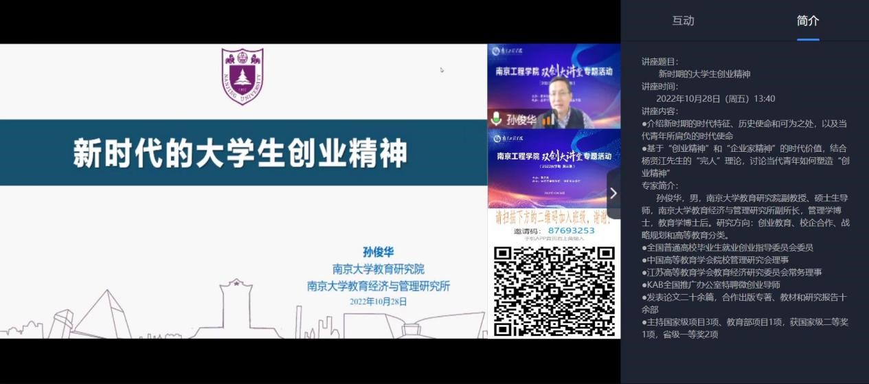 为推进双创教育深入发展,进一步增强学生创新创业精神,提高创新创业能力,营造校园创新创业氛围,2022年10月28日下午,特邀南京大学教育经济与管理研究所副所长孙俊华在工程实践中心6号楼B211开展了以“新时期的大学生创业精神”为主题的双创大讲堂专题活动。活动由经济与管理学院院长张焱主持,工业中心、创新创业学院党委书记王育荣、教师发展中心副处长邢琦参加了本次活动。