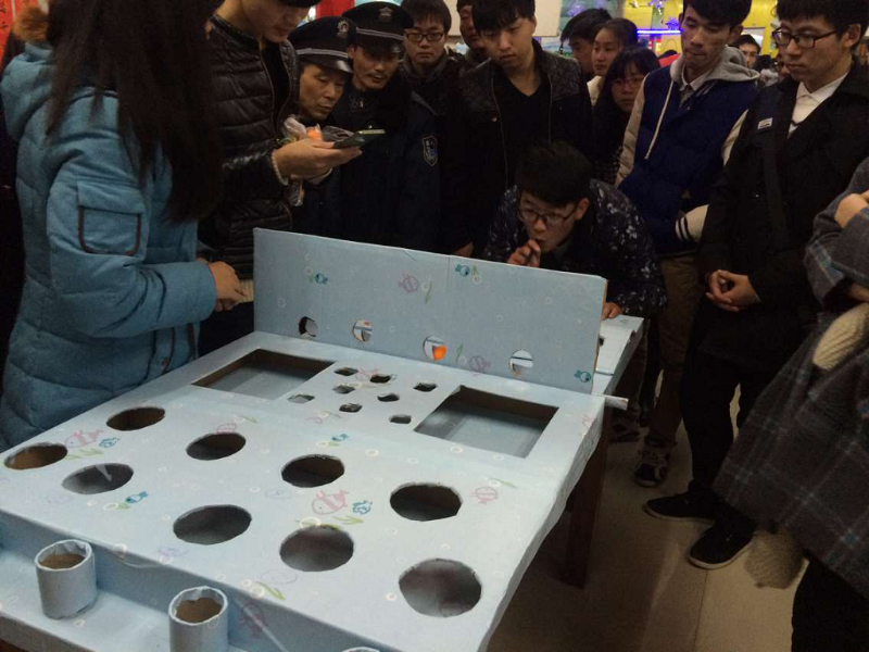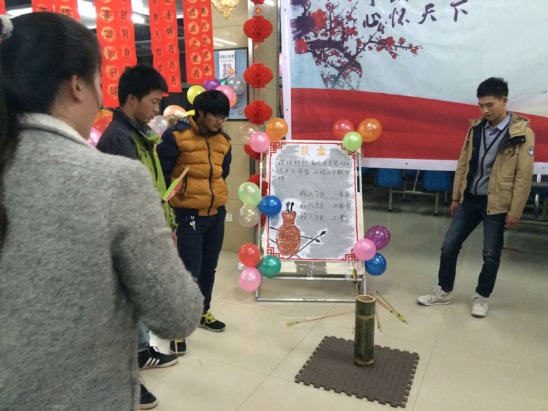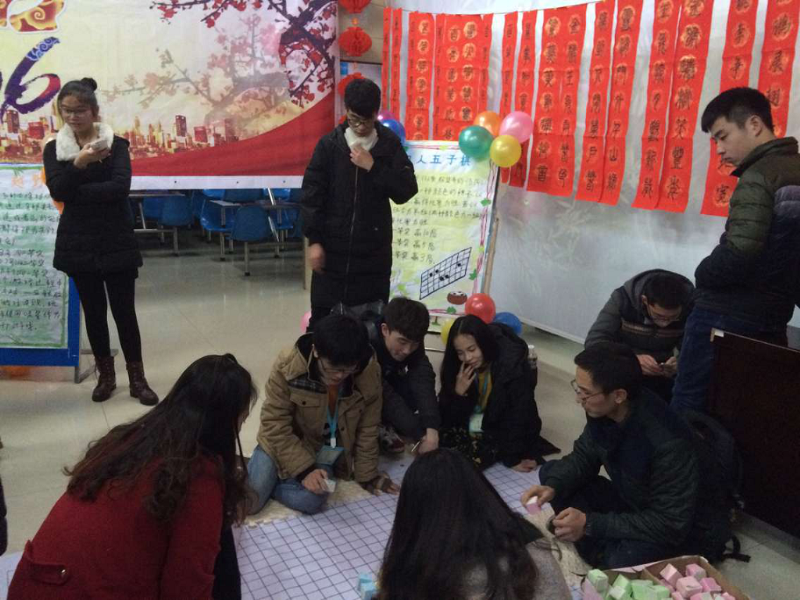 又是一个欢声笑语夜,又是一年辞旧迎新时。12月31日晚6点,我校“Hold住(猴驻)青春-逐梦远航”2016迎新年游园会在北一食堂一楼成功举办!我中心也积极参与,准备了投壶、四人五子棋、趣味吹气球这三个趣味小游戏。学生会成员们一起动手装扮会场,有手工制作的猴子齿轮,有同学手书的祝福春联,有形式各样的大红灯笼,整个会场洋溢着喜庆欢乐的气氛。很多同学前来参加游戏,拿到了丰厚的奖品。