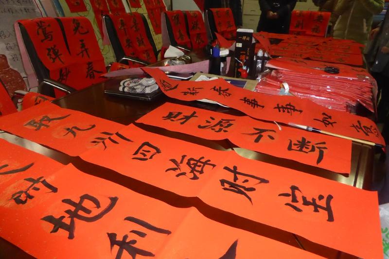 经过精心准备,工业中心党总支书记周明虎、中心主任郁汉琪与同学们一起挥毫泼墨,为大家送上新春祝福。参加春联书写同学,D数控加工132班李铭秋、D自集成152班周嬴等还现场与老师交流了书法技艺。同学们表示:此次活动既可以观看到书法作品,感受节日氛围,还能学习了解中国传统文化知识,也拉近了师生距离。一幅幅火红的春联,烘托出喜庆的节日气氛,一段段祝福美好的文字,代表着中心师生对灿烂生活的向往,大家也通过春联这样一种形式表达了对学校的热爱,和对学校各项事业快速健康发展的期盼。此次春联汇活动,到场师生可以免费领取春联,有上百名老师和同学领取了春联,现场气氛热烈且秩序井然,大家或排队等候,或欣赏已经写好的春联。活动持续至下午4点,全场共书写春联超过150幅。
