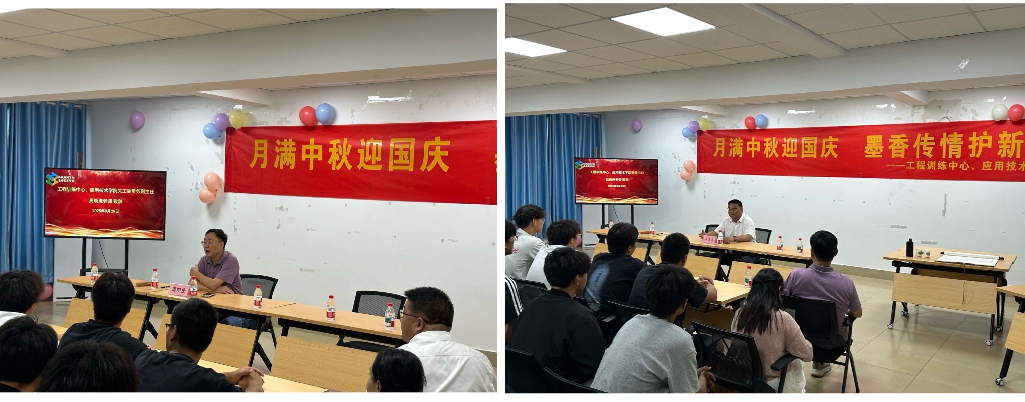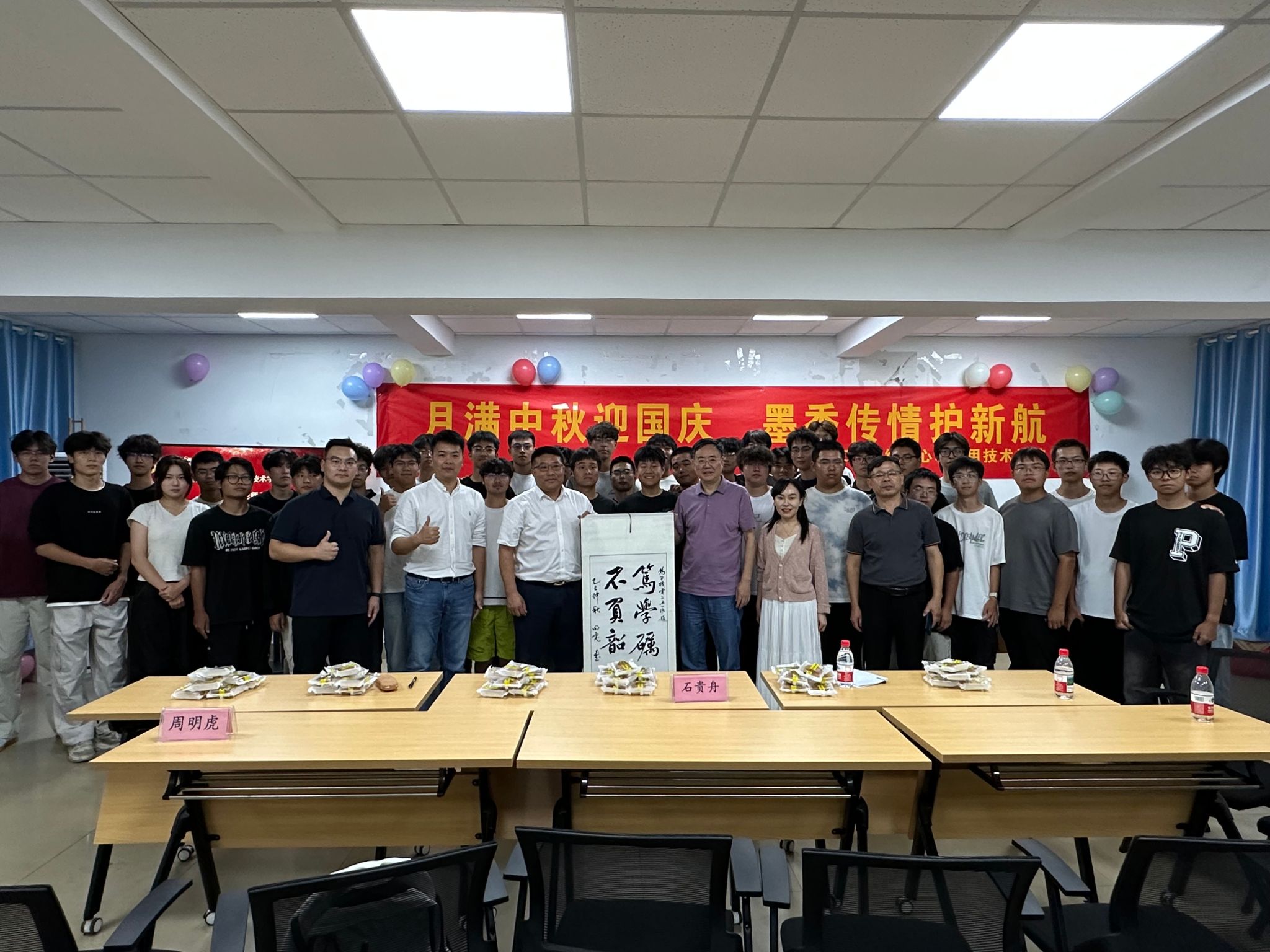国庆良辰歌盛世,中秋圆月照安康。双节将至,为营造喜庆祥和的氛围,助力2025级新生更好地融入大学生活,9月29日,工程训练中心、应用技术学院党委书记石贵舟、党委副书记班生、关工委常务副主任周明虎走进北区萃园9栋L303“一站式”学生社区,举办以“月满中秋迎国庆 墨香传情护新航”为主题的迎双节庆祝活动。