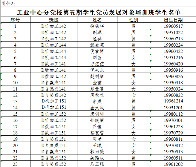 附件2:工业中心分党校第五期学生党员发展对象培训班学生名单。