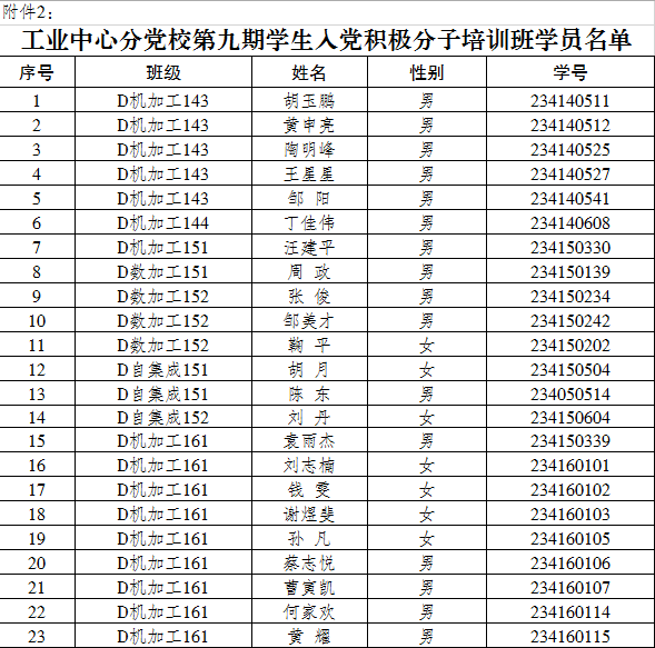 附件2:工业中心分党校第九期学生入党积极分子培训班学员名单。