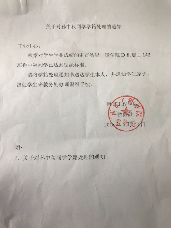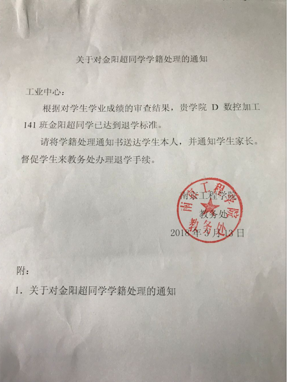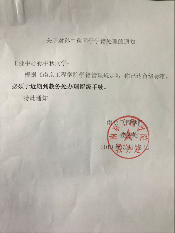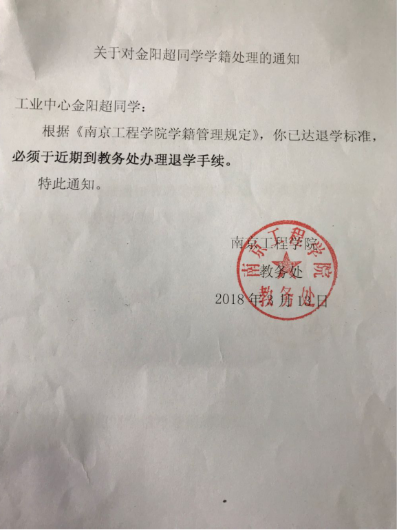 关于金阳超、孙中秋同学学籍处理的通知