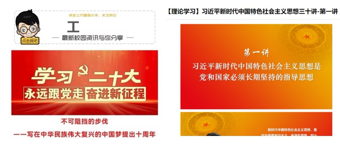 营造学习氛围,广泛宣传二十大精神。工业中心积极开展线上宣传二十大精神活动,充分发挥微信公共号、网站的作用,提供学习资料,提高学习效率,营造学习氛围。中心连续在“活力中心”微信公共号发布二十大精神学习主题,并且为了帮助同学们打牢理论基础,在工业中心网站党建模块开辟了“理论学习”专栏,持续发布“习近平新时代中国特色社会主义思想三十讲”学习课件,推动二十大精神学习不断深入。