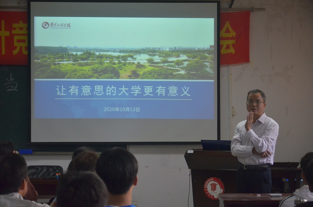郑校长以“筚路蓝缕,薪火相传”、”开拓创新,再谱新篇”、”雄关漫道,蓄势待发”三个相继标题叙述了我校的起源变迁,改革发展的历史和未来前进的方向。他特别讲述了江宁新校区建设,老校区搬迁的历史过程,认为正是全校师生的共同奋斗,不断攻坚克难使校区置换顺利完成,从而为学校发展打开了更大空间。他说,我校的办学历史体现出显著的创新创业精神,南京工程学院是一所创新创业型大学。他说,在我校的多年的发展建设过程中一直贯穿着”建设特色鲜明高水平大学”这条主线,学校依靠“知行统一,创新创业”的精神,依靠学校党委的有力领导和师生员工的艰苦努力,坚持面向地方区域经济社会发展,培养应用型人才,取得了一系列显著成绩, 2019年孙春兰副总理、吴政隆省长视察我校,是对我校的充分肯定。关于学校未来发展,郑校长详细介绍了校第三次党代会提出的三步走发展战略。他说,学校将抓住研究生教育发展机遇,坚持应用型人才培养,坚持走产学研相结合的发展路径,努力建成特色鲜明的高水平应用型工程大学。