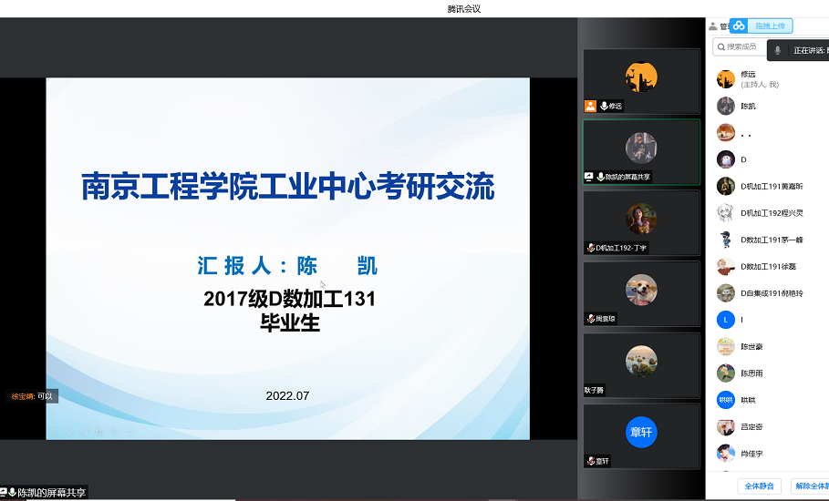 7月10日晚,工业中心邀请优秀校友东南大学在读博士陈凯等为2023届考研同学做了线上考研经验分享,2023届考研同学参加了活动,分享活动取得了良好效果。