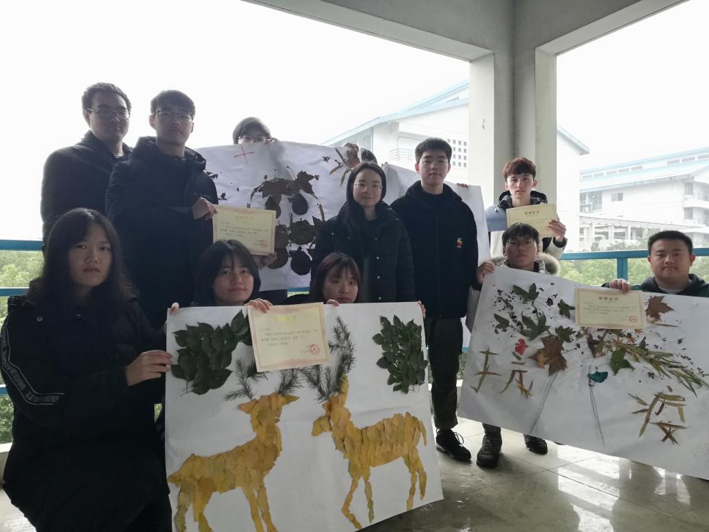 中午比赛正式开始,选好树叶等材料后,选手们纷纷开始动手创作。大家都准备非常充分,有的带来了手绘的银杏叶,有的带来了亲自制作的干花,有的带来画笔。其中一组参赛队员,现场手绘了两只可爱的小鹿,仔细地将树叶裁剪、拼贴。2点左右同学们陆续完成了作品,有的像在森林里觅食的小鹿,有的用树叶进行了拟人化创作,拼出了“戴口罩的人”……
